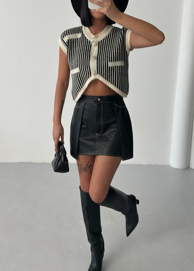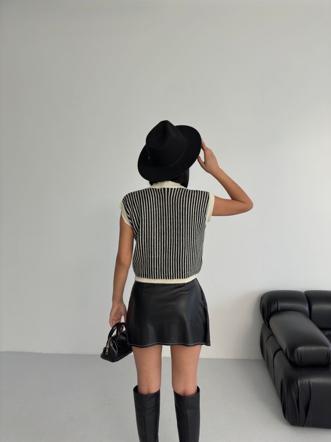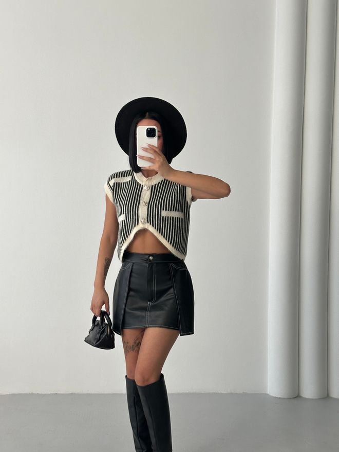 Γυναικεία μπλούζα μαύρη,ριγέ,ρετρό,crop με patch τσέπες .Η μαύρη ριγέ,crop αμάνικη μπλούζα είναι αυτό το essential του χειμώνα που δεν λείπει ποτέ από την γκαρνταρόμπα.