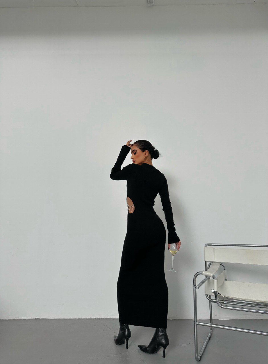Γυναικείο φόρεμα μαύρο μάξι με κλειστό μπούστο,άνοιγμα στο πλάι,διακοσμημένο με αλυσίδα.Υπάρχουν πολλοί τρόποι για να φορέσεις ένα μαύρο φόρεμα και η αλήθεια είναι πως αυτός είναι ένας από τους λόγους για τους οποίους αγαπάμε τόσο πολύ αυτά τα φορέματα.