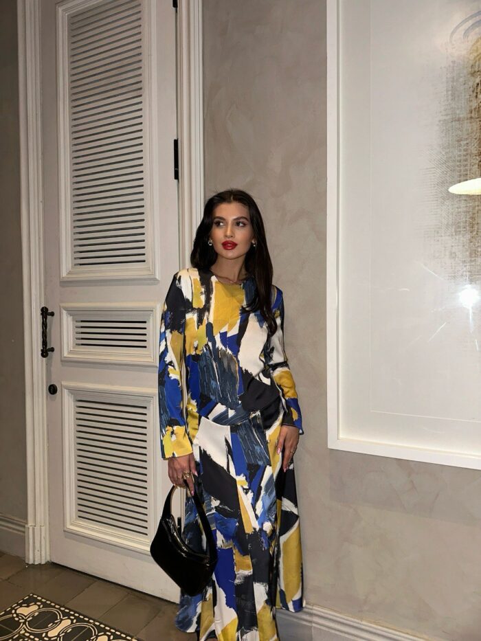 Γυναικείο φόρεμα πολύχρωμο,μάξι σε άλφα γραμμη με κλειστό μπούστο και μακρυά μανίκια.