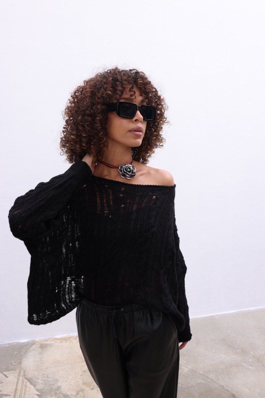 Το μαύρο πλεκτό με σκισίματα είναι μια πολύ καλή ενδυματολογική επιλογή για μία βόλτα φορώντας ένα τζίν,άνετα παπούτσια,sneakers ή μπoτάκια.