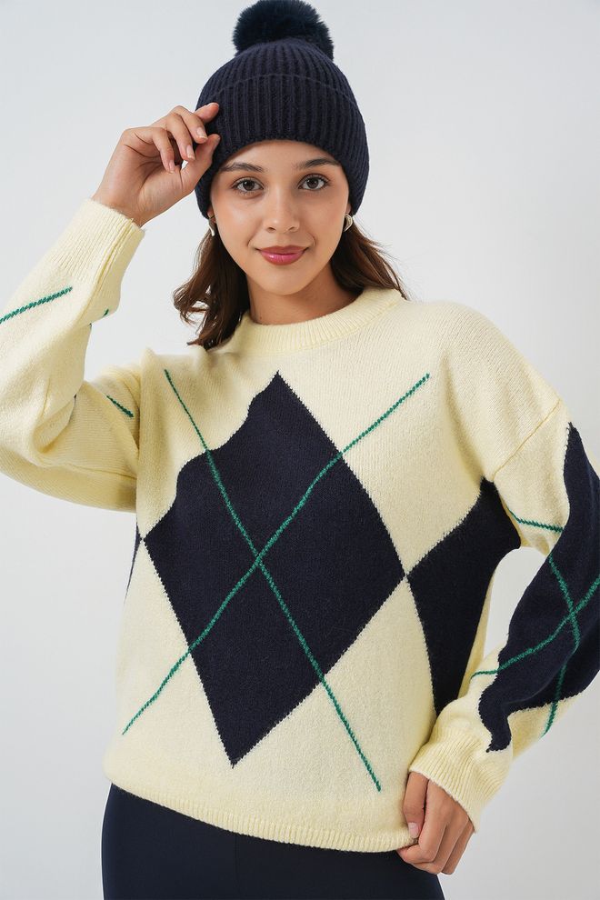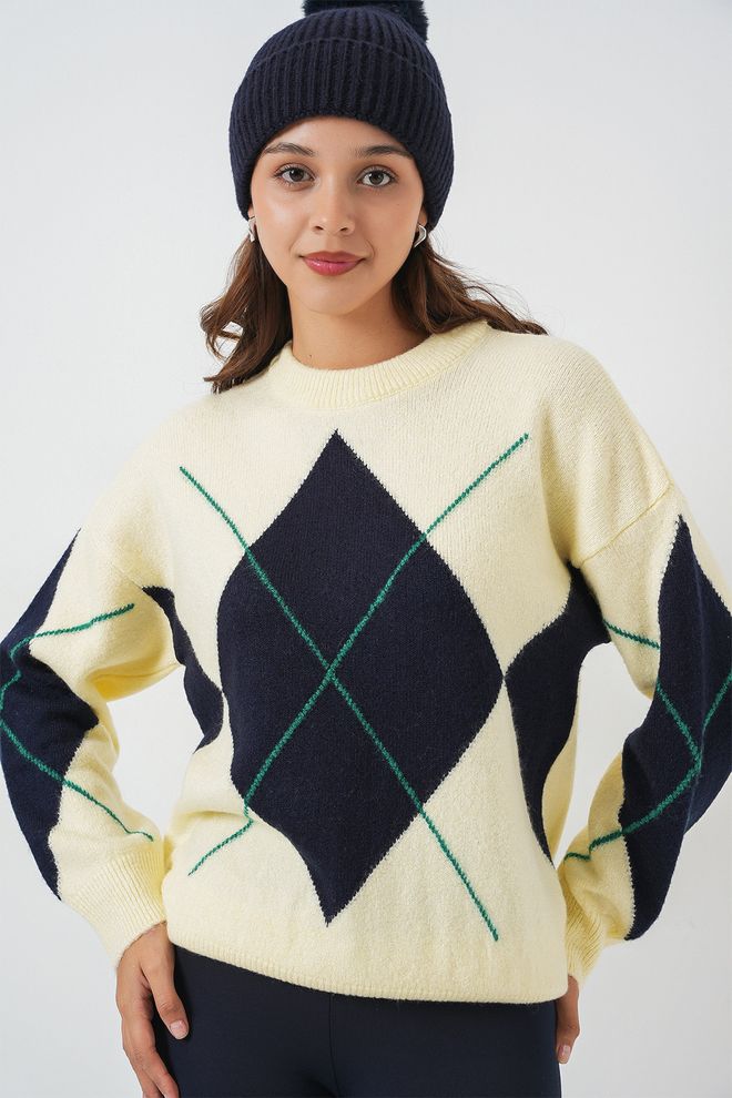 Γυναικείο πουλόβερ μπέζ με ρωμβούς μπλέ σε στύλ μπακλαβά,με στρόγγυλη λαιμόκοψη.Το πουλόβερ με ρώμβους είναι αυτό το essential του χειμώνα που δεν λείπει ποτέ από την γκαρνταρόμπα.