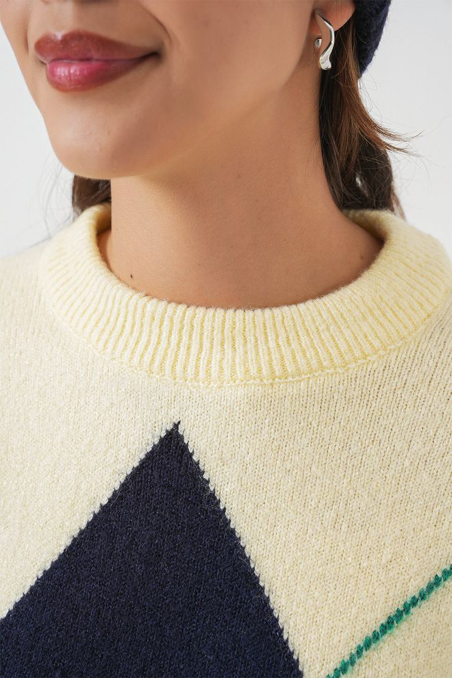 Το μπέζ πουλόβερ με μπλέ ρώμβους και πράσινες λεπτομέρειες είναι μια πολύ καλή ενδυματολογική επιλογή για μία βόλτα φορώντας ένα τζίν,άνετα παπούτσια,sneakers ή μπoτάκια.