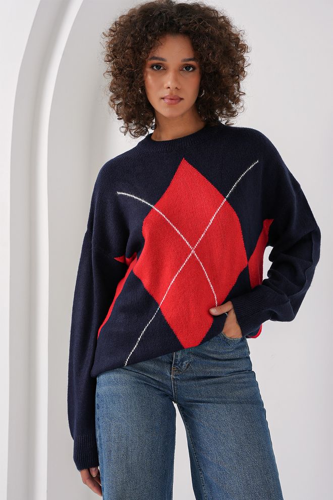 Γυναικείο πουλόβερ μπλέ με ρωμβούς κόκκινους σε στύλ μπακλαβά.Το πουλόβερ με ρώμβους είναι αυτό το essential του χειμώνα που δεν λείπει ποτέ από την γκαρνταρόμπα.