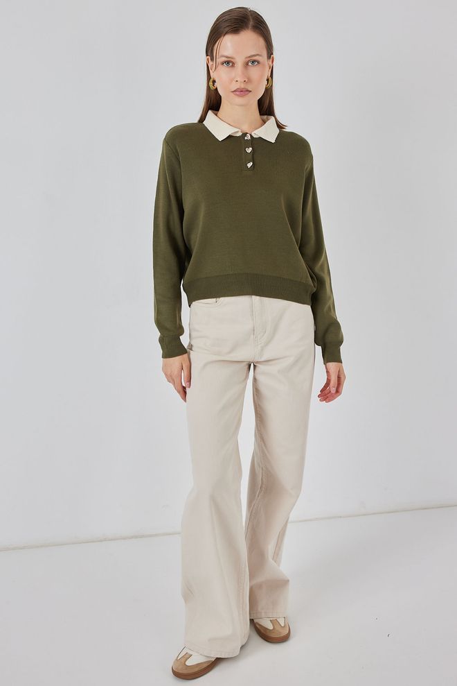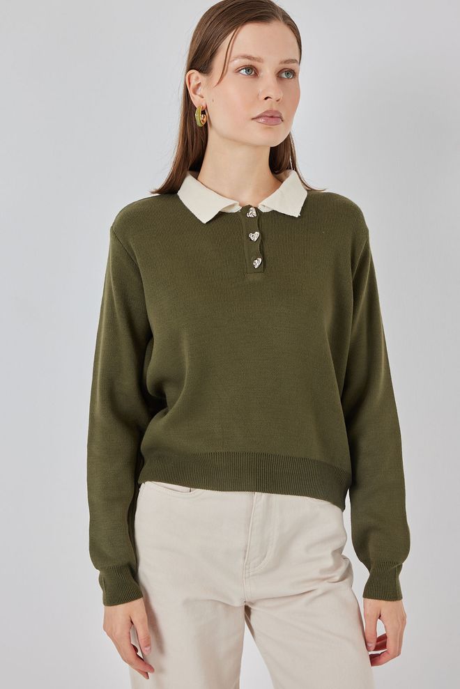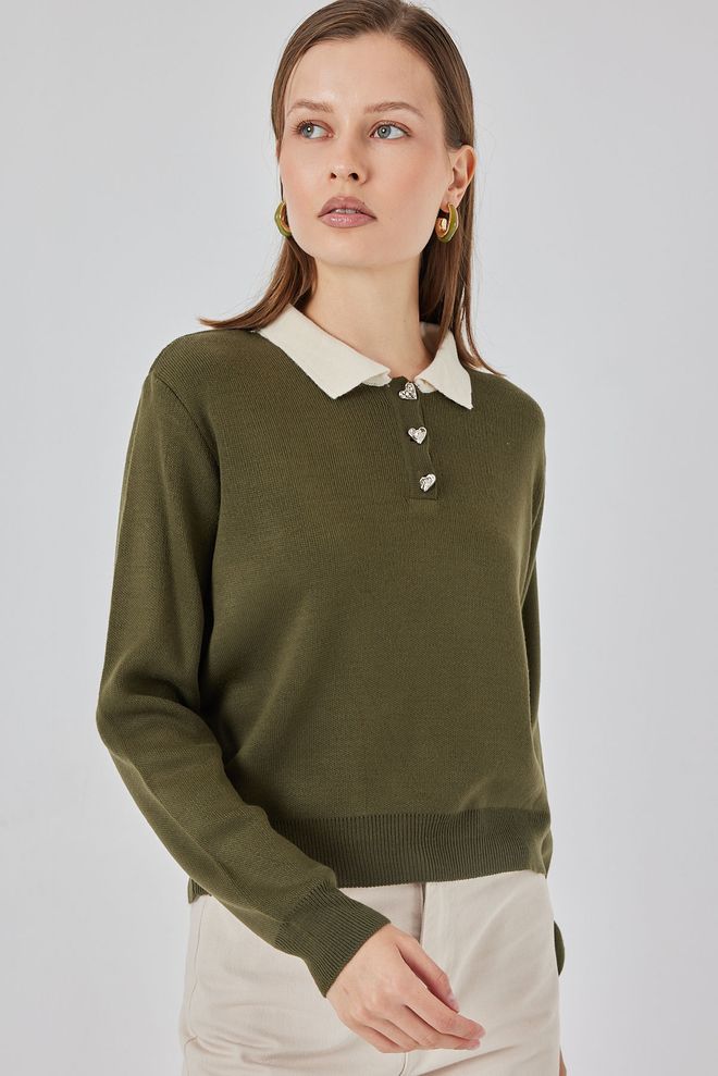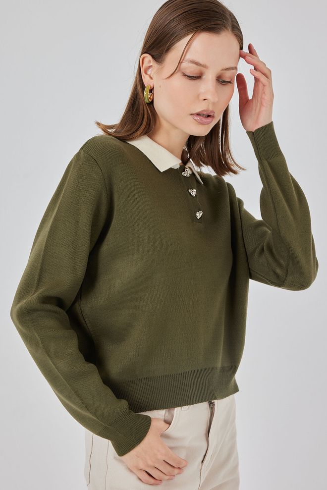 Γυναικείο πουλόβερ χακί με μπέζ γιακά και κουμπιά μπροστά σε σχέδιο καρδιά με μακρυά μανίκια.Το χακί πουλόβερ είναι αυτό το essential του χειμώνα που δεν λείπει ποτέ από την γκαρνταρόμπα.
