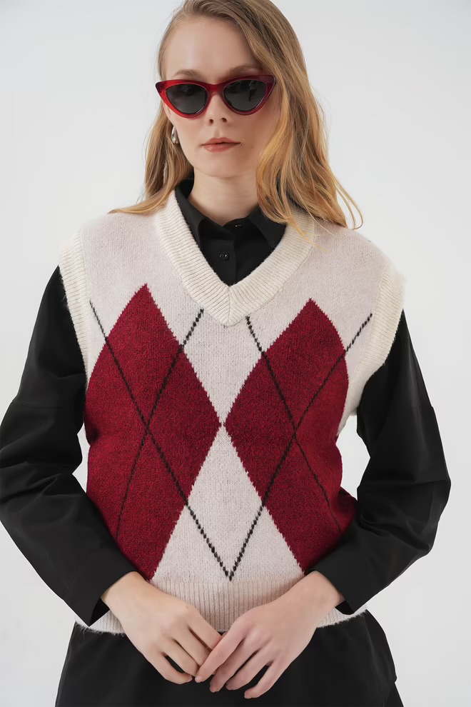 Γυναικείο πουλόβερ γιλέκο κρέμ,μπορντό με v λαιμό.