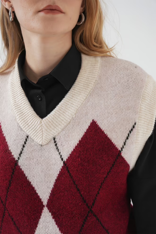 Τέλος το κρέμ,μπορντό,πουλόβερ γιλέκο με v λαιμό μπορείς άψογα να το συνδυάσεις με λευκό,μαύρο πουκάμισο,με μαύρο παντελόνι και μποτάκια με τακούνι είναι το κλασικό σύνολο του dress code του γραφείου.