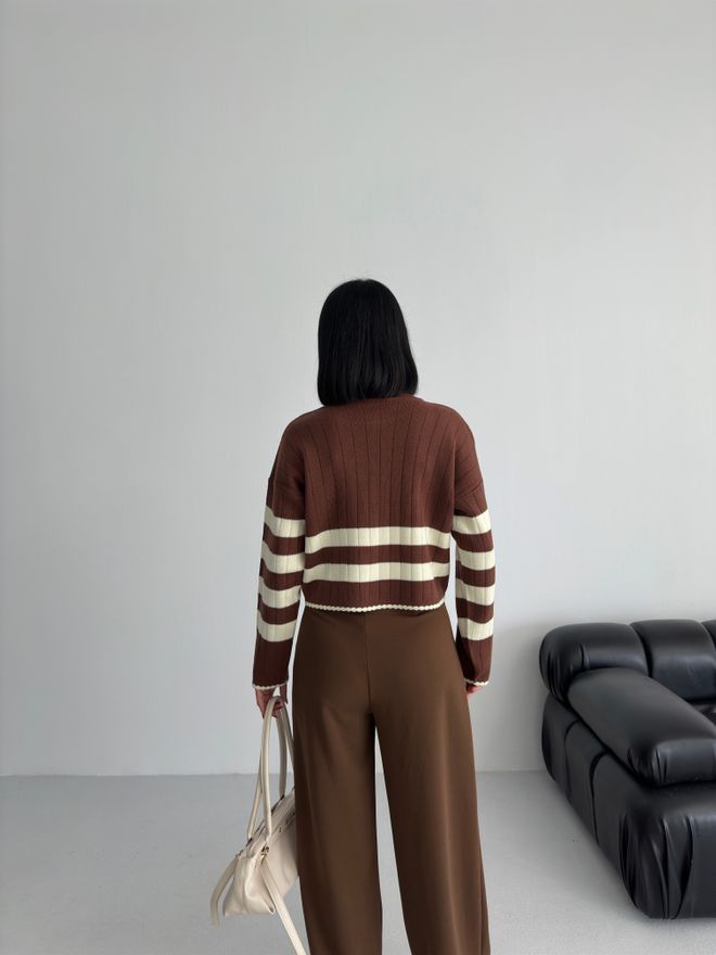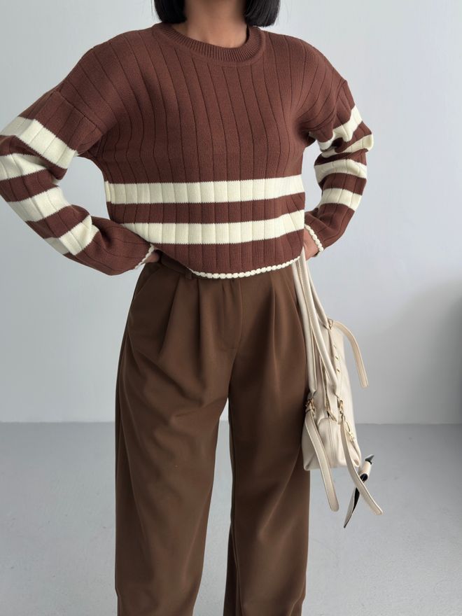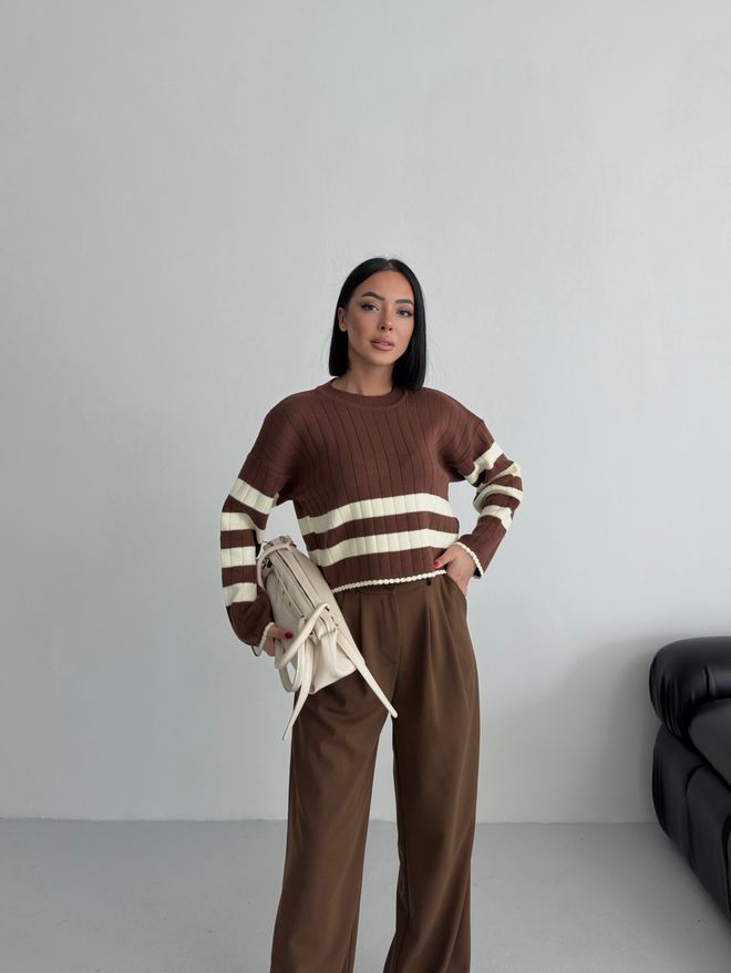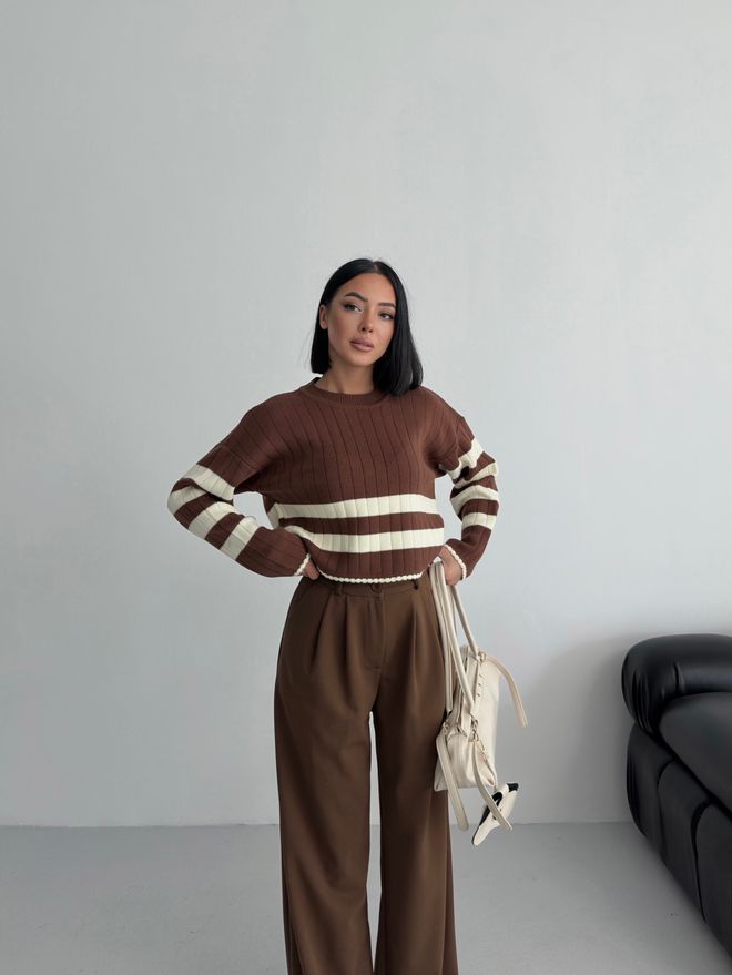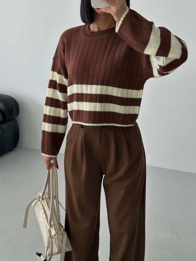 Το καφέ πουλόβερ με άσπρες ρίγες είναι μια πολύ καλή ενδυματολογική επιλογή για μία βόλτα φορώντας ένα τζίν,άνετα παπούτσια,sneakers ή μπoτάκια.