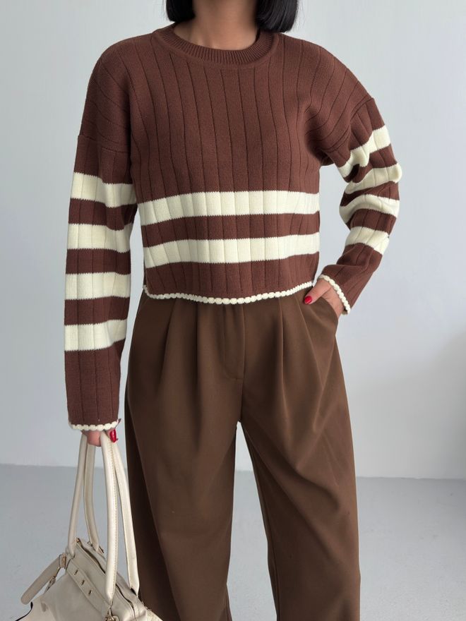 Γυναικείο πουλόβερ καφέ με άσπρες ρίγες,στρογγυλή λαιμόκοψη και μακρυά μανίκια.Το καφέ πουλόβερ είναι αυτό το essential του χειμώνα που δεν λείπει ποτέ από την γκαρνταρόμπα.