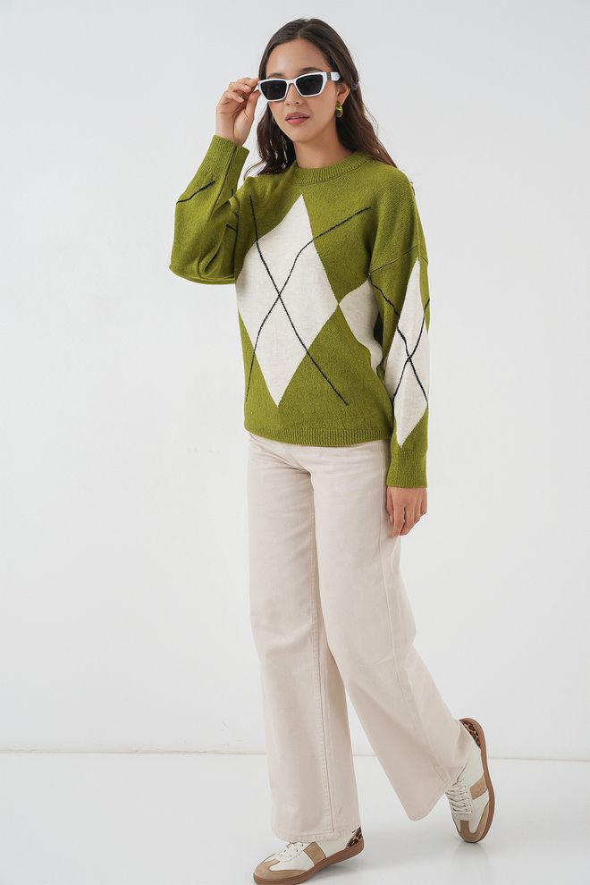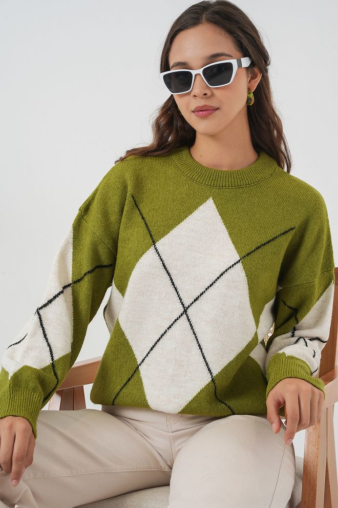 Γυναικείο πουλόβερ λάιμ με ρωμβούς άσπρους και μαύρες λεπτομέρειες σε στύλ μπακλαβά,με στρόγγυλη λαιμόκοψη.Το πουλόβερ με ρώμβους είναι αυτό το essential του χειμώνα που δεν λείπει ποτέ από την γκαρνταρόμπα.