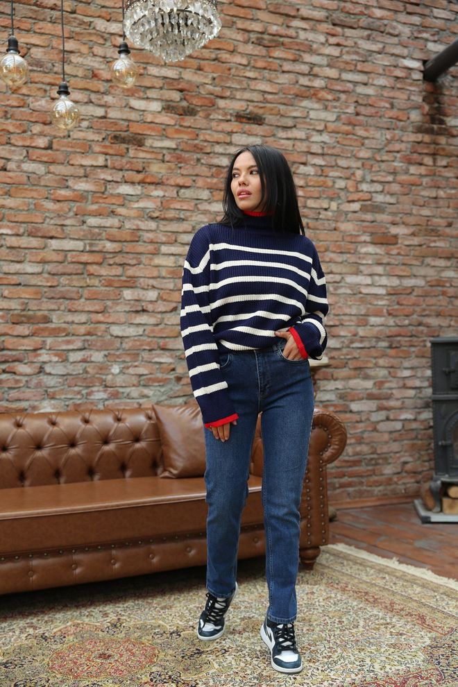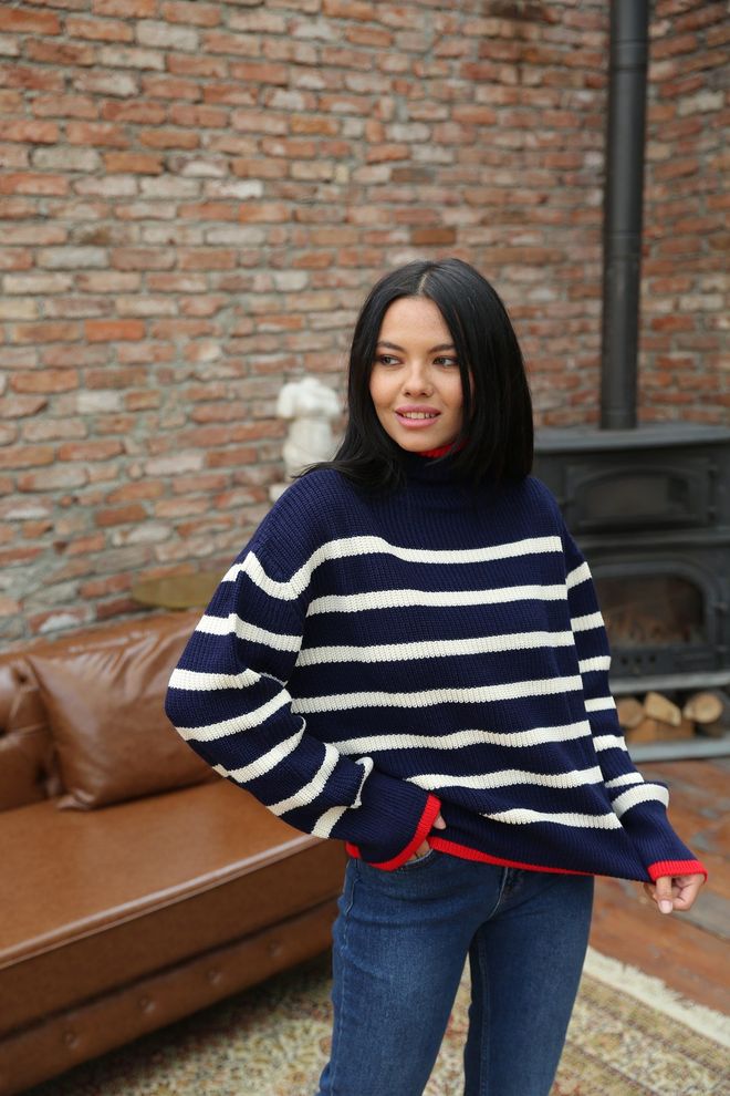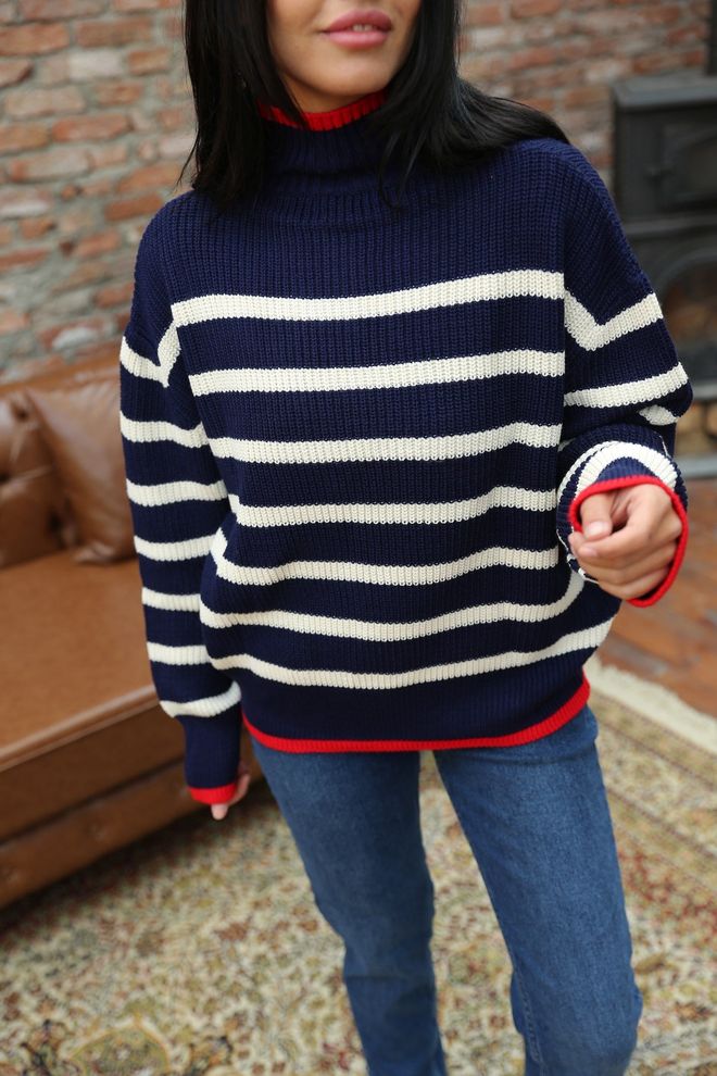 Γυναικείο πουλόβερ τρικότ με ρίγες χρώματος μπλέ,κόκκινο και άσπρο μεγέθους one size.Το τρικότ πουλόβερ είναι αυτό το essential του χειμώνα που δεν λείπει ποτέ από την γκαρνταρόμπα.