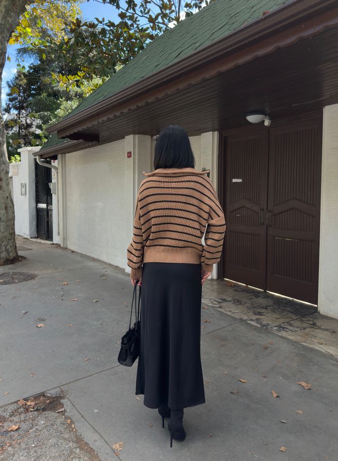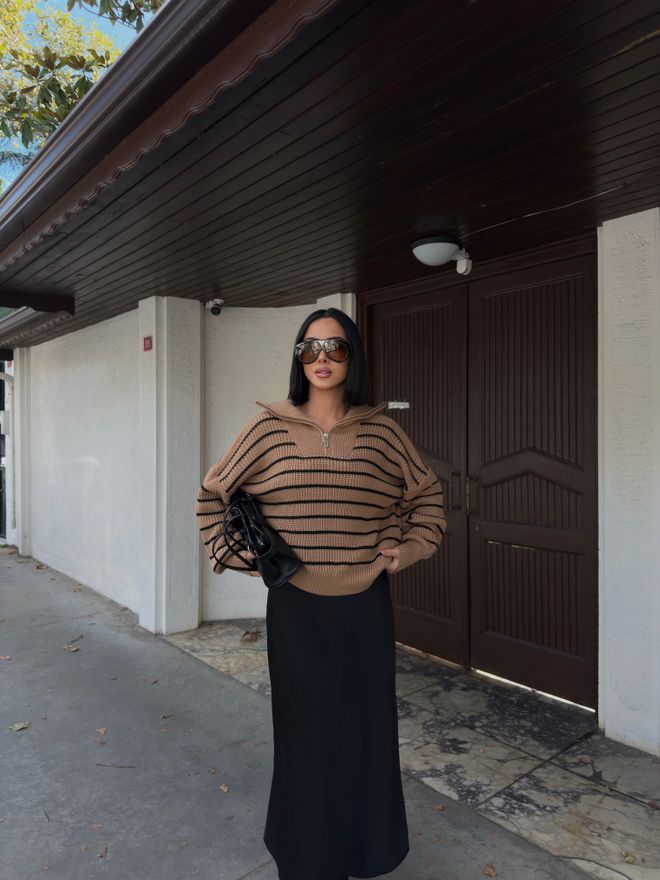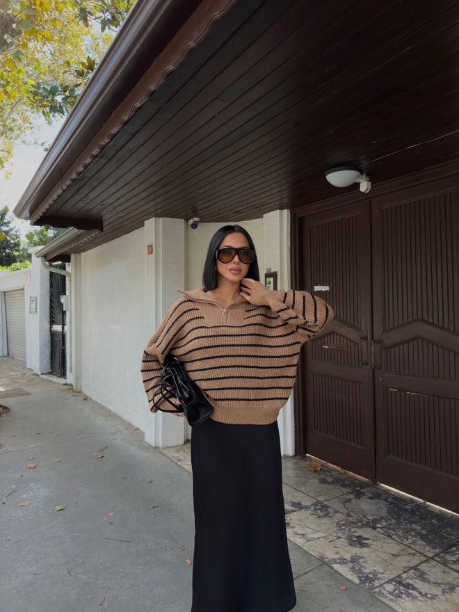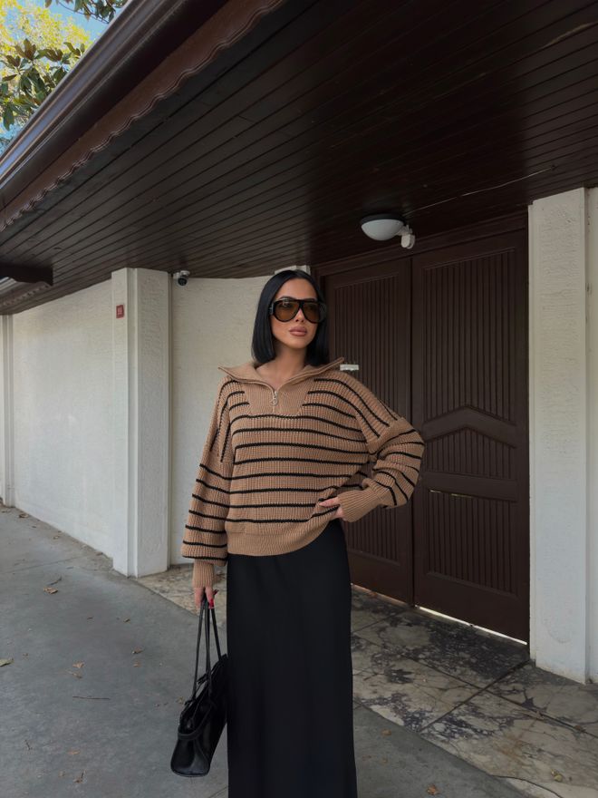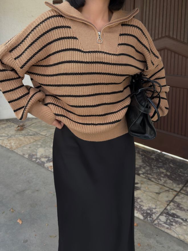 Γυναικείο πουλόβερ white coffee ριγέ με μαύρο,φερμουάρ και γιακά.Το πουλόβερ white coffee ριγέ με μαύρο συγκαταλέγεται στα απαραίτητα κομμάτια που χρειάζεται να έχει μία γυναίκα στη γκαρνταρόμπα της.Είναι η τελευταία τάση της μόδας και πέρα από το γεγονός πως είναι ιδανικο για άνοιξη,φθινόπωρο και χειμώνα είναι πως ταιριάζει με τα πάντα και μπορούμε να το φορέσουμε με διαφορετικούς τρόπους.Με παντελόνια και πάνω από σαλοπέτες ή με φούστες και τζίν,οι συνδυασμοί που μπορούμε να πετύχουμε είναι άπειροι και μάλιστα για διάφορες περιστάσεις.Το γυναικείο πουλόβερ με white coffee ριγέ με μαύρο,φερμουάρ και γιακά αποδεικνύεται ιδιαίτερα χρήσιμο και για να πετύχουμε layering στα σύνολα μας.Αρκεί να το φορέσετε πάνω από τα πουκάμισα,και τα φορέματα για ένα έξτρα cozy αποτέλεσμα.