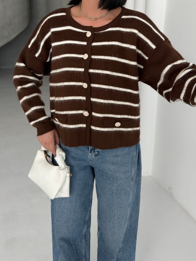 Γυναικεία ζακέτα καφέ-άσπρη με τσέπες και κουμπιά στο στήθος.Η ριγέ ζακέτα είναι αυτό το essential όλης της χρονιάς που δεν πρέπει να λείπει από την γυναικεία γκαρνταρόμπα.