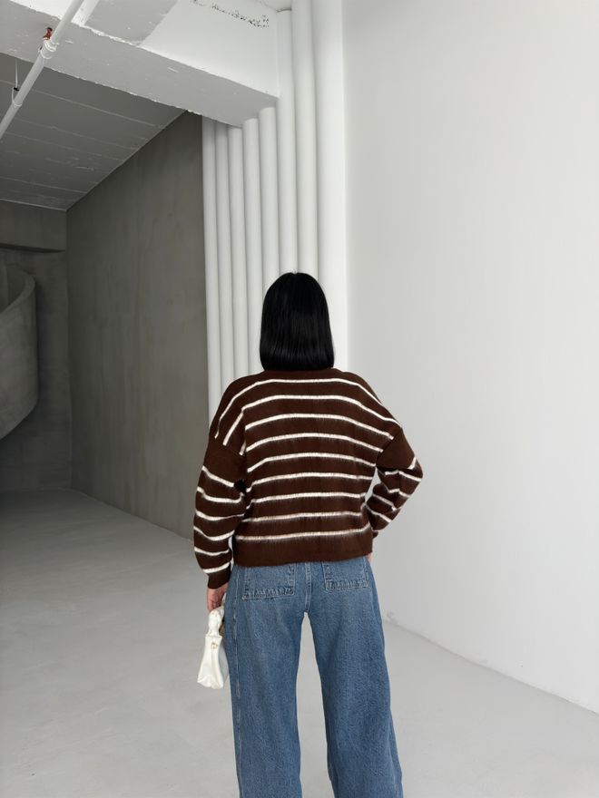 Η καφέ-άσπρη ριγέ ζακέτα με κουμπιά στο στήθος και τσέπες είναι μία πολύ καλή ενδυματολογική επιλογή για μία βόλτα φορώντας ένα τζίν,άνετα παπούτσια,sneakers ή πλατφόρμες.